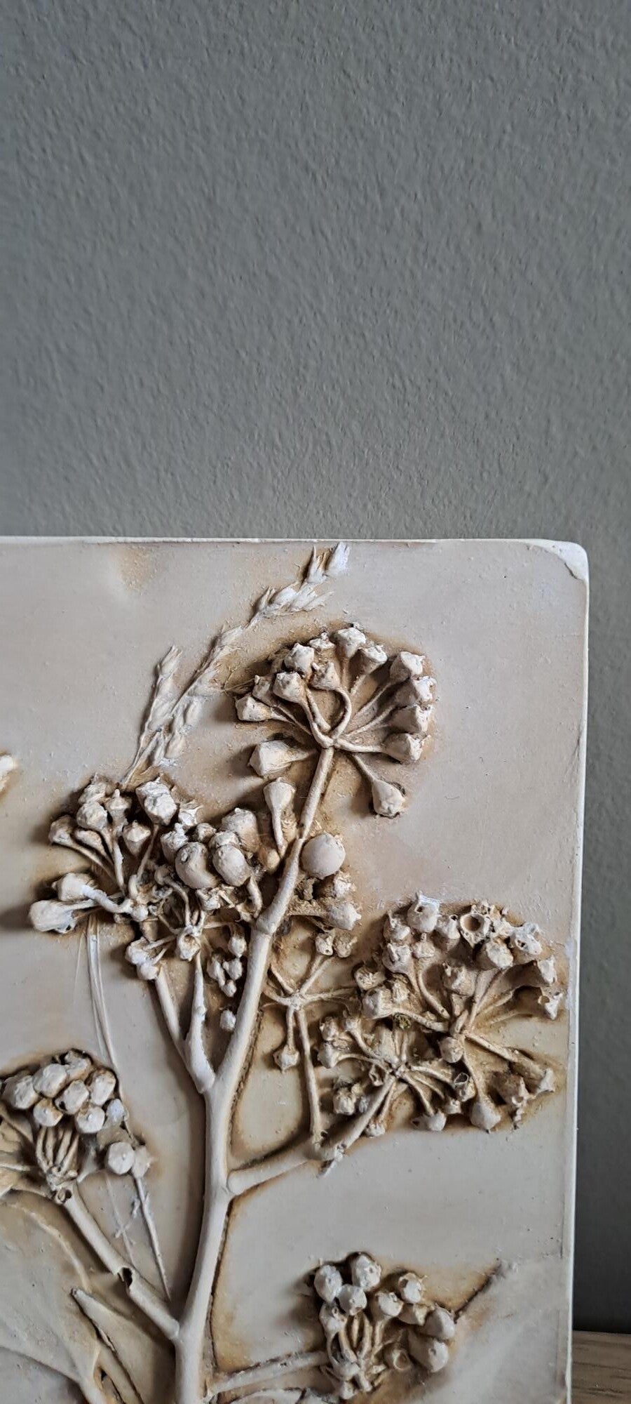 Deze vierkante botanische gipstegel is een subtiel en tijdloos kunstwerk waarin echte planten zijn vereeuwigd. Deze tegel is perfect als uniek decoratiestuk in huis.